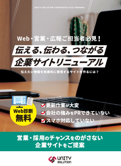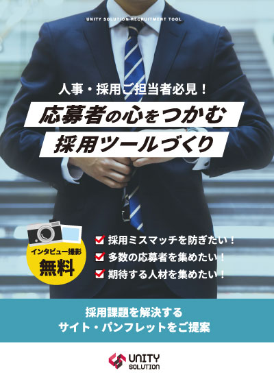 DOWNLOAD 資料ダウンロード ユニティーソリューションではウェブ制作や運用等にお役に立てる資料をご案内しています。 ご希望の資料をクリックしてください。 サイトリニューアルをする3つのメリットとは?ビジネスチャンスをつかみましょう! DOWNLOAD 「選ぶ」から「選ばれる」採用へ!採用課題を解決する3つのポイントをご紹介します。 DOWNLOAD